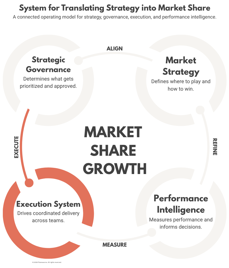 The system for structuring, coordinating, and delivering initiatives across teams to ensure execution aligns with strategy and drives measurable market share growth.