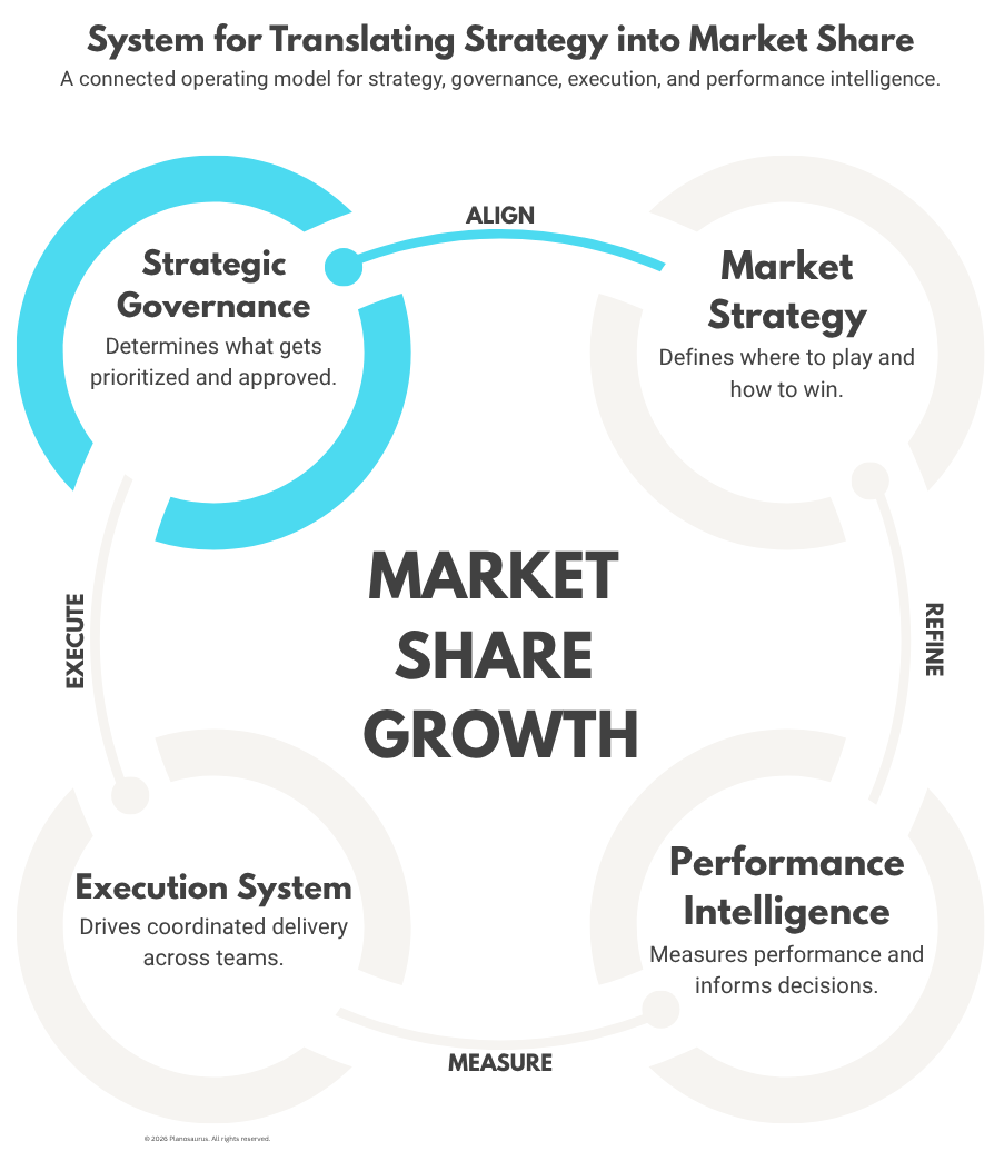 Strategic Governance connects strategy to execution by determining what gets prioritized and approved.